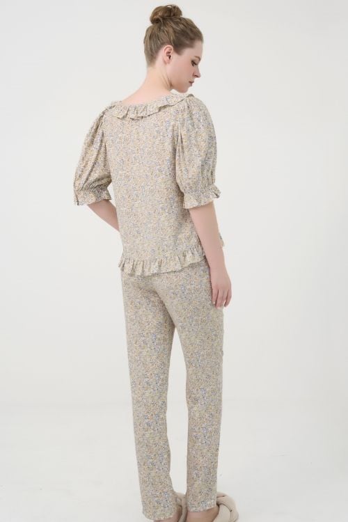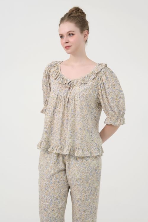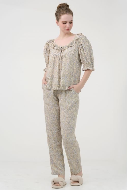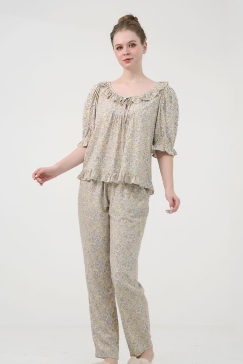Bộ đồ dài mặc nhà với thiết kế cổ phối bèo và tay phồng tinh tế mang đến vẻ ngoài nữ tính, dịu dàng và cảm giác thoải mái tối đa. Chất liệu tole ngoại nhập cao cấp, mềm mại và thoáng mát, kết hợp cùng họa tiết in hoa lá, tạo nên bộ đồ mặc nhà hoàn hảo.