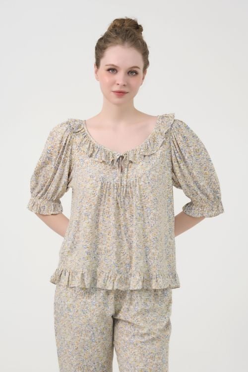 Áo thiết kế cổ phối bèo và tay phồng tinh tế, tạo điểm nhấn nữ tính và duyên dáng. Dáng áo suông nhẹ, thoải mái.kêt hợp với quần dài cạp chun co giãn, dễ mặc và vận động.