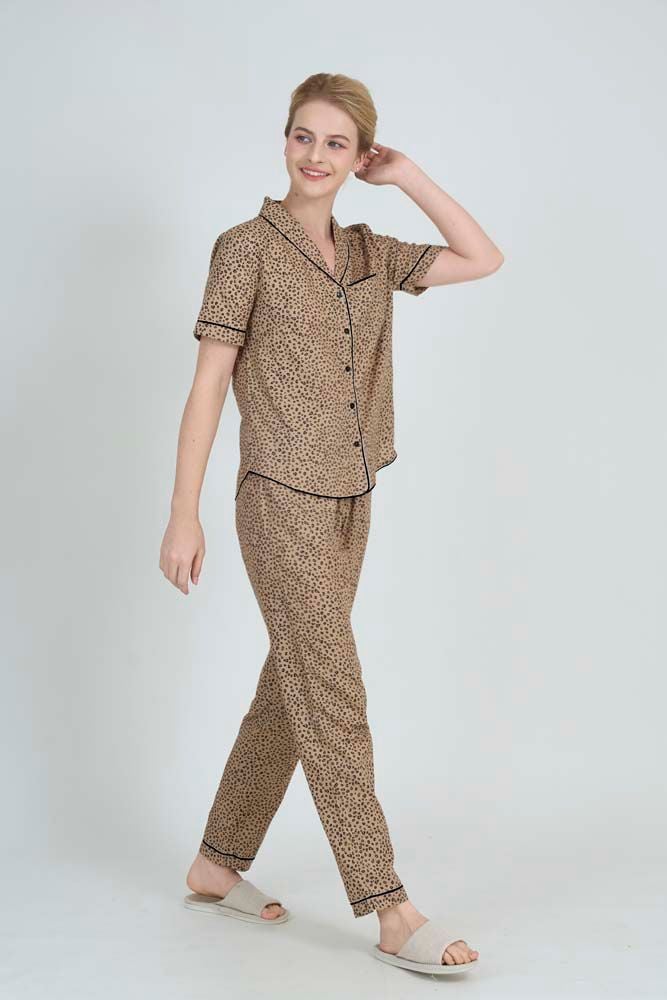 Kết hợp quần dài thoải mái và áo ngắn tay cổ bâu sam nữ tính. Viền mí nổi bật tạo điểm nhấn, đường may tỉ mỉ, chắc chắn.
