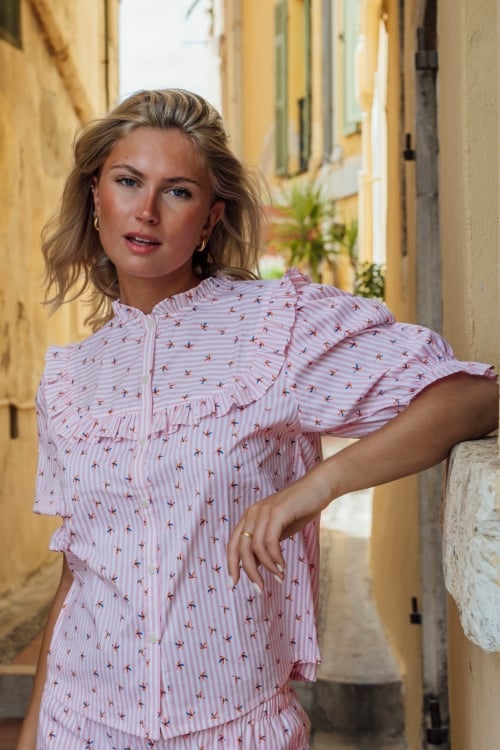 Họa tiết sọc hồng kết hợp in họa tiết nhiều màu độc đáo, vừa nữ tính vừa trẻ trung, đầy sức sống. Đây là điểm nhấn nổi bật giúp bộ trang phục trở nên khác biệt và thu hút hơn.