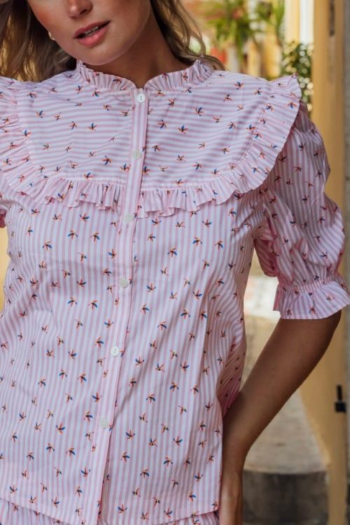 Áo thiết kế cổ tròn rộng dễ mặc, phối viền bèo duyên dáng chạy quanh cổ và lai áo, tạo hiệu ứng bồng bềnh nhẹ nhàng, giúp người mặc thêm phần ngọt ngào và trẻ trung. Dáng áo suông thoải mái, không kén dáng, phù hợp cho mọi hoạt động sinh hoạt thường ngày, kết hợp quần lửng dáng suông, ống quần phối bèo tinh tế, tạo sự đồng điệu với áo, giúp bạn luôn dễ chịu. Độ dài lửng vừa vặn, mang lại sự gọn gàng và thoải mái tối đa.