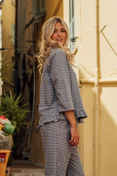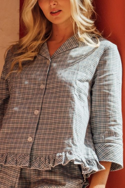 Hoạ tiết caro xám xanh nhã nhặn, hiện đại nhưng vẫn mang hơi hướng cổ điển, giúp bộ trang phục vừa trẻ trung vừa thanh lịch. Đây là lựa chọn hoàn hảo cho những ai yêu thích sự nhẹ nhàng nhưng không kém phần sang trọng trong đồ mặc nhà.