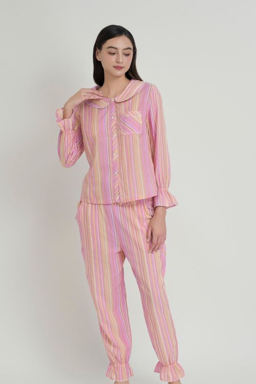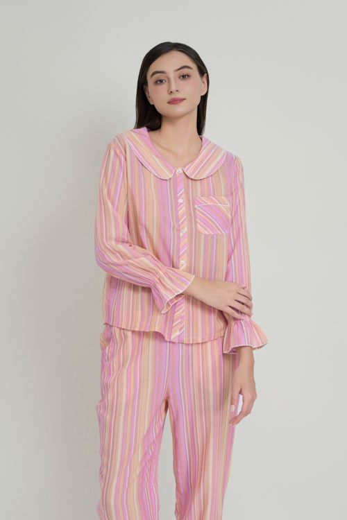 Bộ pyjama vải kate, áo tay dài quần dài. Áo cổ peter pan.