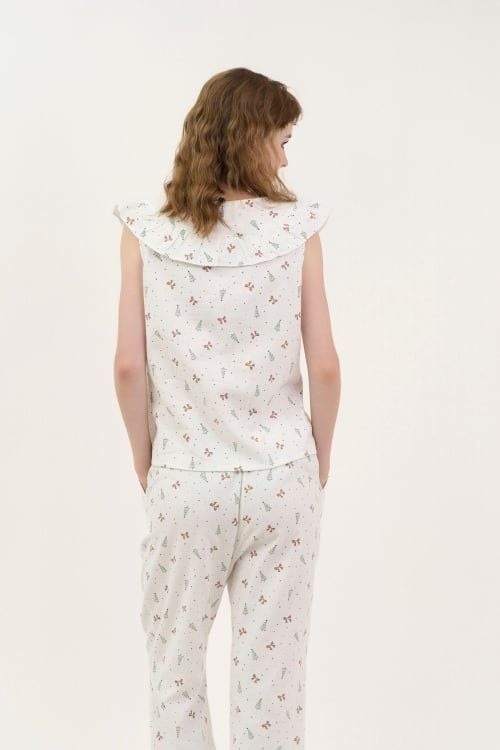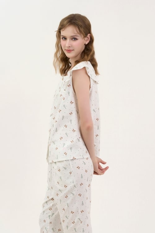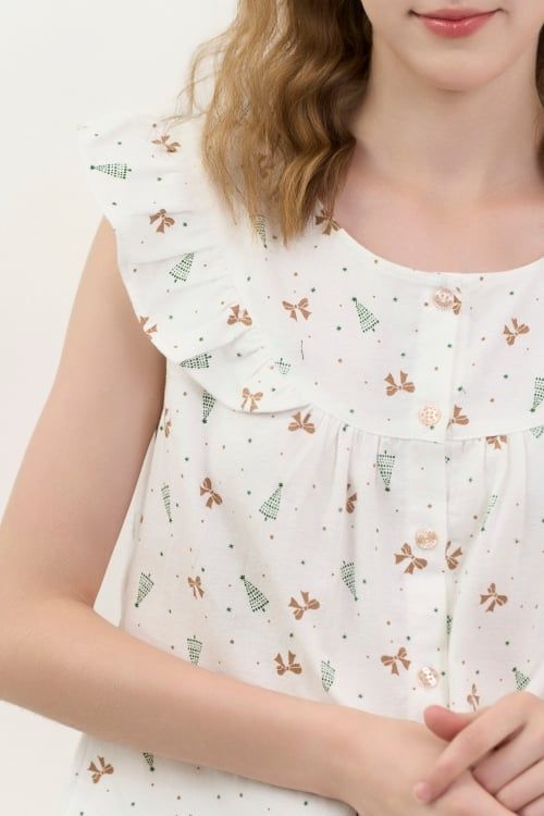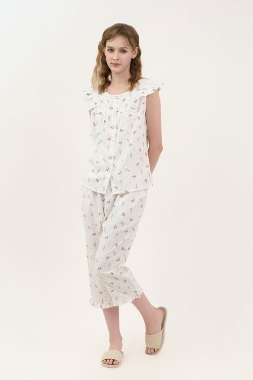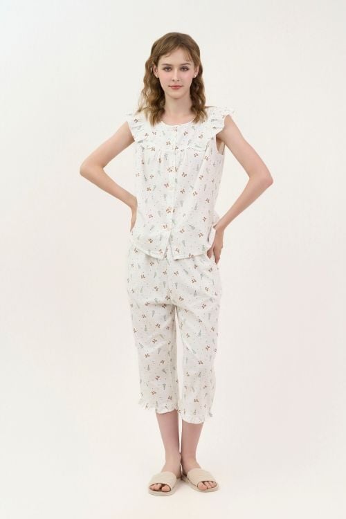 Bộ đồ lửng, áo sát nách, cổ tròn, có phần bèo to ở cổ là điểm nhấn. Quần lửng thoải mái. Thiết kế mang phong cách năng động, trẻ trung.