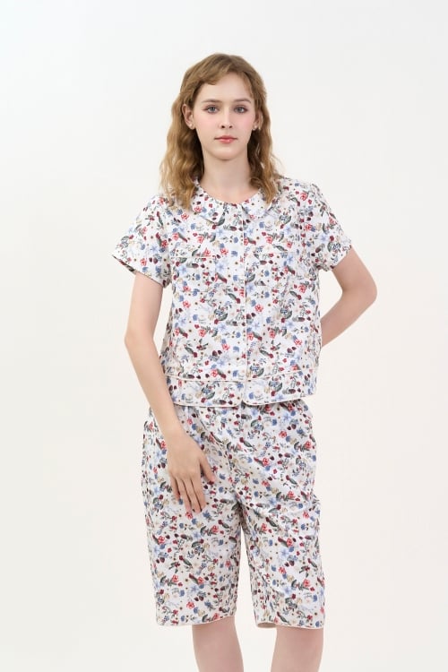 Bộ đồ lửng cổ lá sen, có viền mí nổi bật. Quần lửng thoải mái. Thiết kế mang phong cách năng động, trẻ trung.