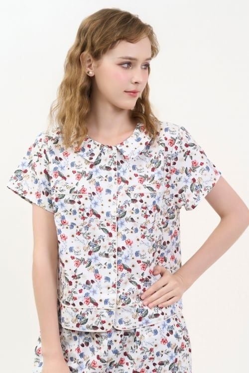 Họa tiết in hoa lá trên nền vải trắng xinh xắn, mang đến cảm giác tươi mới, tràn đầy nữ tính.