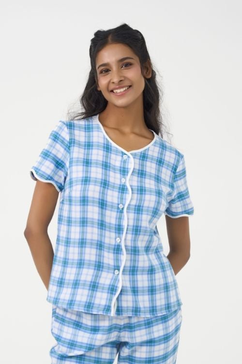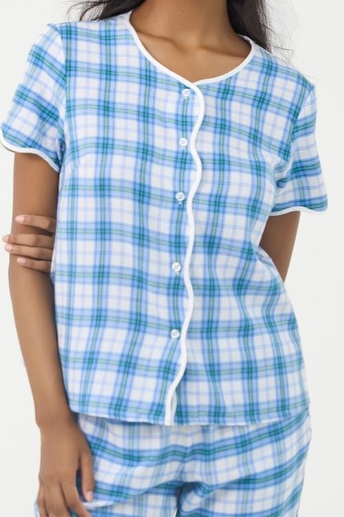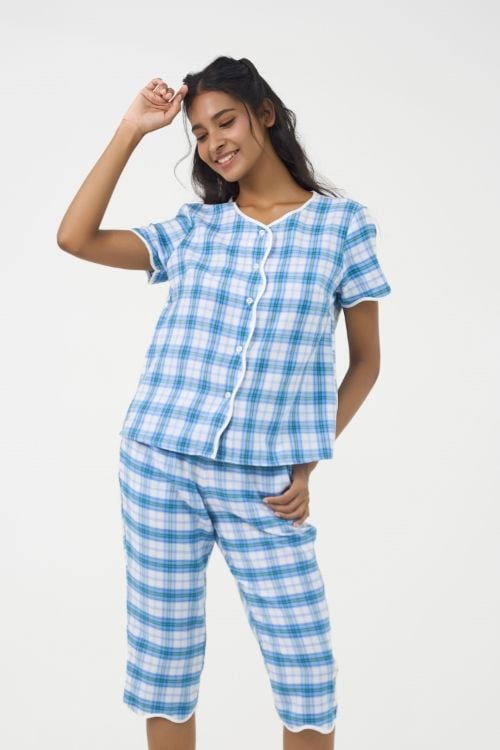 Bộ đồ lửng cổ tròn với đường viền lượn sóng độc đáo tạo điểm nhấn năng động và trẻ trung. Họa tiết caro hiện đại kết hợp cùng chất liệu kate cao cấp, mềm mại và thoáng mát, mang đến sự thoải mái tối đa cho người mặc suốt cả ngày