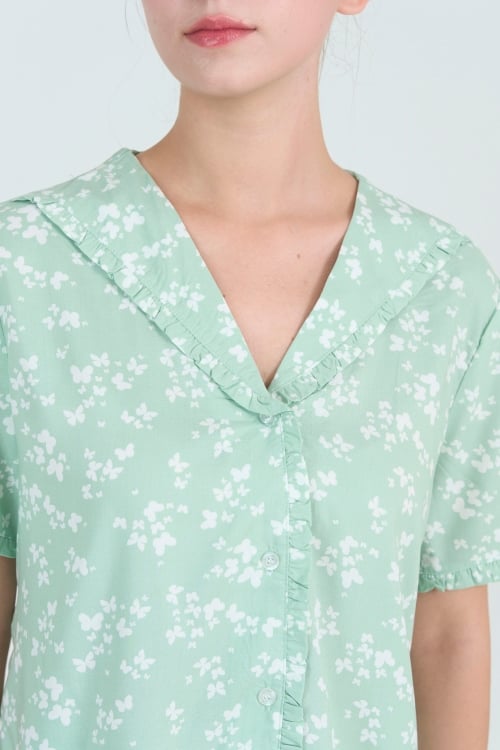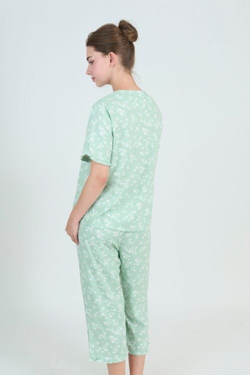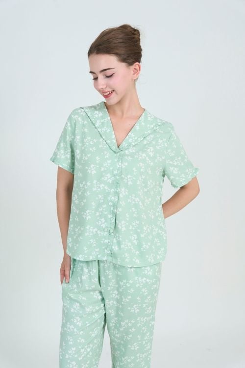 Thiết kế theo kiểu dáng pijama, mang đến sự thoải mái và dễ chịu. Điểm nhấn là đường may bèo dún tinh tế ở cổ áo, lai tay và lai quần, tạo nét duyên dáng và nữ tính. Form dáng rộng rãi, thoải mái vận động. Quần lửng có độ dài vừa phải.