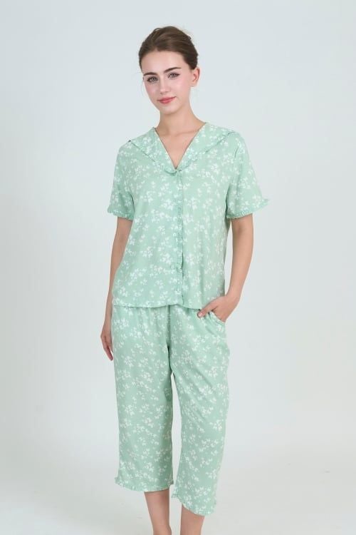 Bộ đồ lửng mặc nhà thiết kế pijama với điểm nhấn bèo dún tinh tế ở cổ áo, lai tay và lai quần, mang đến sự thoải mái và thoáng mát tối đa. Chất liệu tole ngoại nhập giúp bạn thư giãn tuyệt đối tại nhà.