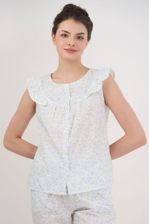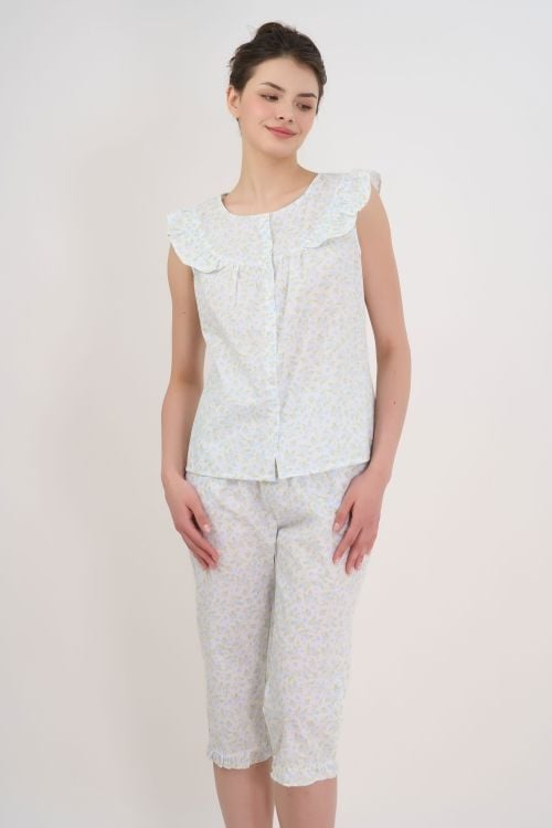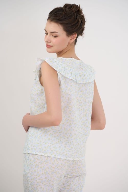 Bộ đồ lửng, áo sát nách, cổ tròn, có phần bèo to ở cổ là điểm nhấn. Quần lửng thoải mái. Thiết kế mang phong cách năng động, trẻ trung.