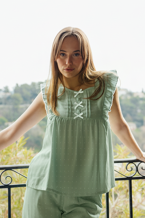 Thiết kế áo cổ tròn duyên dáng, tay cánh tiên trẻ trung kết hợp với quần lửng ngang bắp chân, bộ trang phục còn được trang trí them những đường rode nổi bật mang lại sự trẻ trung thoải mái tối đa khi mặc ở nhà.