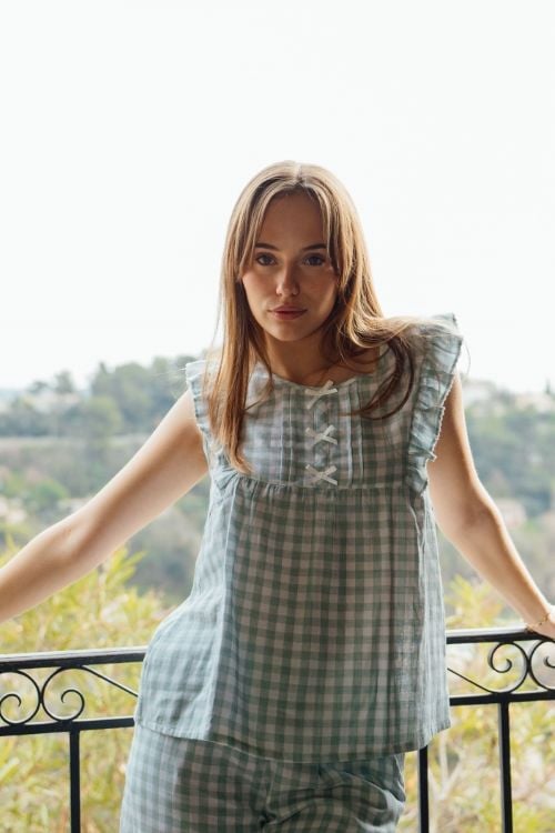 Bộ đồ lửng mặc nhà kate 2 lớp cao cấp từ VINCY mang đến sự thoải mái và phong cách cho mùa Xuân Hè 2025. Thiết kế cổ tròn duyên dáng, tay cánh tiên, phom dáng xòe nhẹ cùng chất liệu ngoại nhập cao cấp mềm mịn, thoáng mát và họa tiết in caro trắng xanh hiện đại.