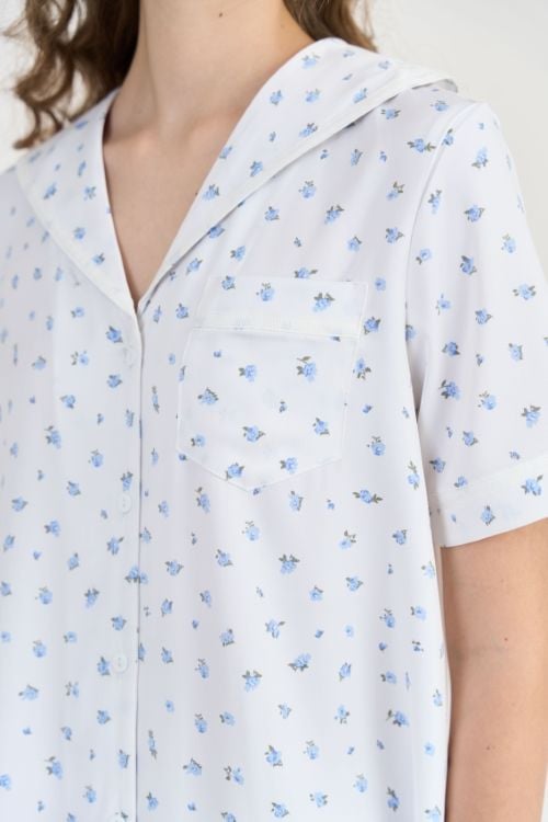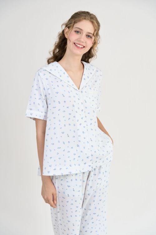 Kiểu dáng pijama lửng, thoải mái và kín đáo vừa đủ. Áo thiết kế cổ bâu sam lịch sự, điểm nhấn là đường viền ru băng nổi bật ở cổ áo và tay áo vài lai quần, tạo nên nét độc đáo và thu hút. Phom dáng rộng rãi, không gò bó, giúp người mặc thoải mái vận động.Đường may tỉ mỉ, chắc chắn đảm bảo chất lượng sản phẩm