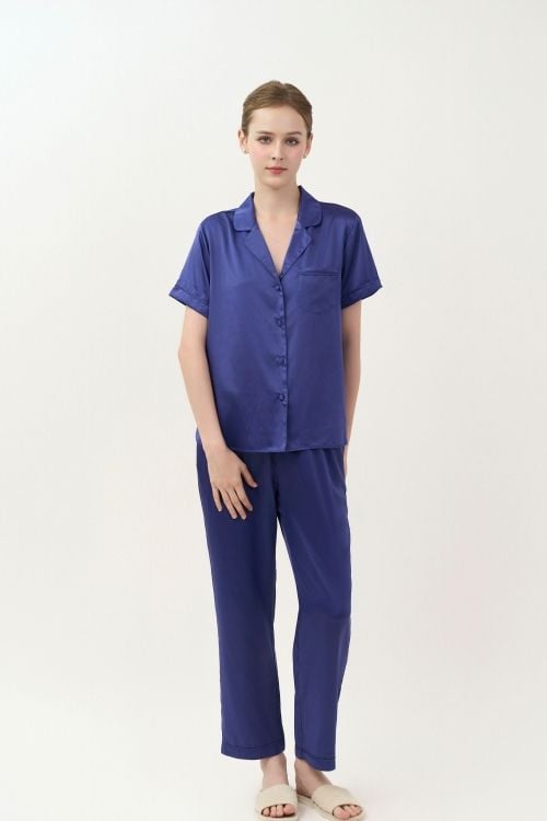 Thỏa sức tận hưởng sự thoải mái và thời trang với bộ đồ ngủ pijama satin cao cấp, mềm mịn với họa tiết xanh thời thượng, viền nổi bật. Thiết kế tay ngắn, quần dài thoải mái, mang đến vẻ đẹp quyến rũ và giấc ngủ ngon giấc.