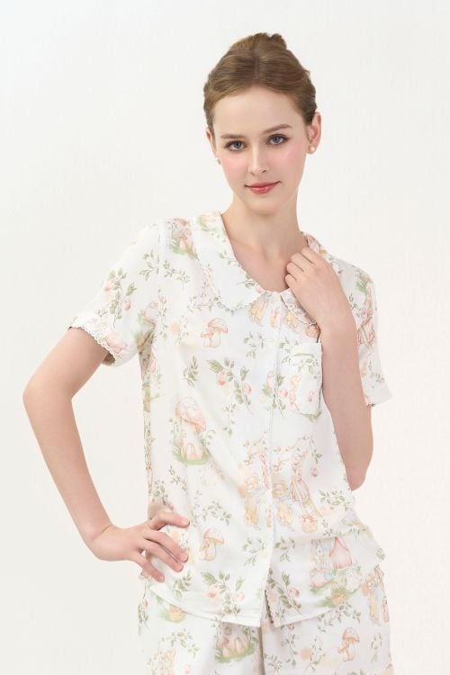 Áo tay ngắn, cổ lá sen điệu đà, tạo điểm nhấn, phom dáng rộng rãi, năng động, phù hợp với mọi dáng người.