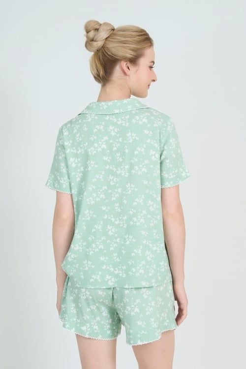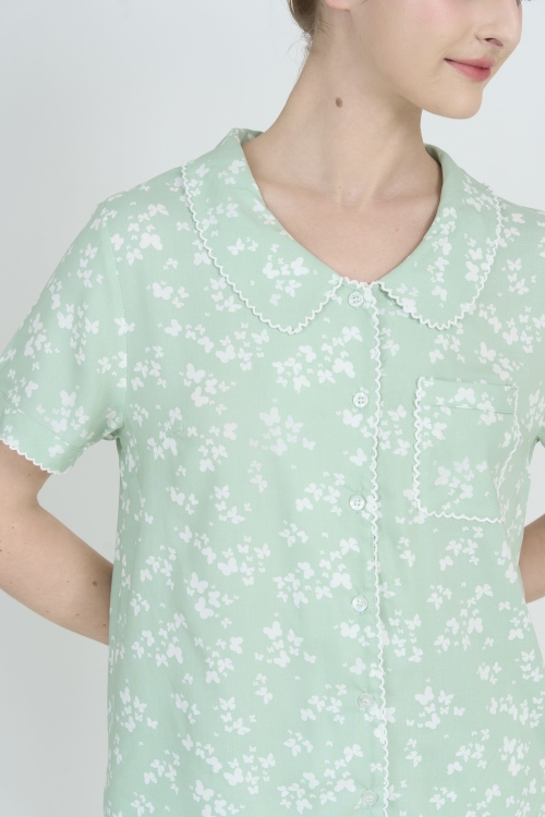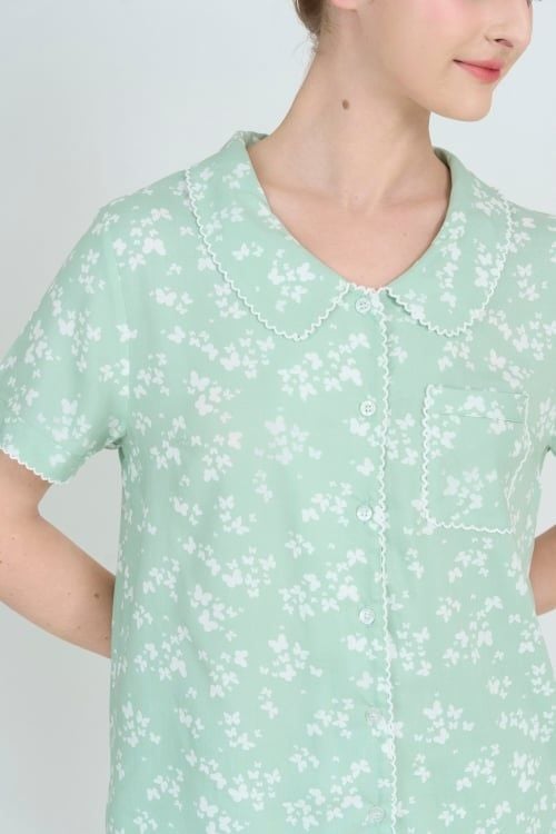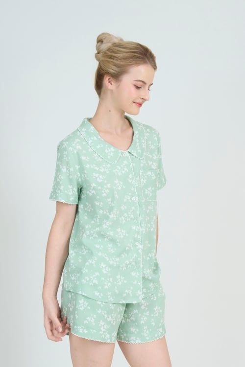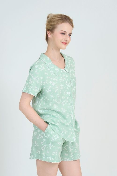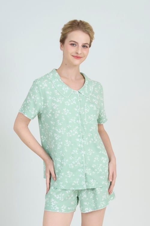 Sắc xanh bạc hà dịu nhẹ điểm xuyết bởi những đóa hoa nhí trắng tinh khôi tạo nên một tổng thể vô cùng hài hòa và mát mắt. Họa tiết này mang lại cảm giác thư thái, tươi mới, giúp bạn luôn rạng rỡ ngay cả khi nghỉ ngơi tại gia.