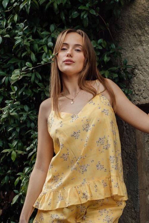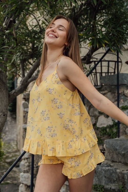 Bộ đồ short mặc nhà kate cao cấp từ VINCY mang đến sự thoải mái tuyệt đối với thiết kế 2 dây quyến rũ và phom dáng xòe nhẹ. Điểm nhấn đặc biệt là những đường phối bèo dún ở lai áo và lai quần, mang đến vẻ tươi mới và nữ tính cho mùa Xuân Hè 2025. Chất liệu ngoại nhập cao cấp mềm mịn, thoáng mát cùng họa tiết hoa nhí xinh xắn trên nền vải màu vàng sẽ mang đến trải nghiệm thư giãn tuyệt vời.