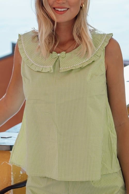 Bộ đồ ngủ Kate caro ngắn cao cấp với thiết kế cổ bèo tròn duyên dáng cùng viền ren trắng tinh tế, mang đến vẻ đẹp ngọt ngào, trẻ trung và đầy nữ tính. Kiểu dáng áo sát nách thoáng mát kết hợp với quần short viền bèo xinh xắn, giúp nàng tận hưởng cảm giác thoải mái tối đa trong những ngày hè.