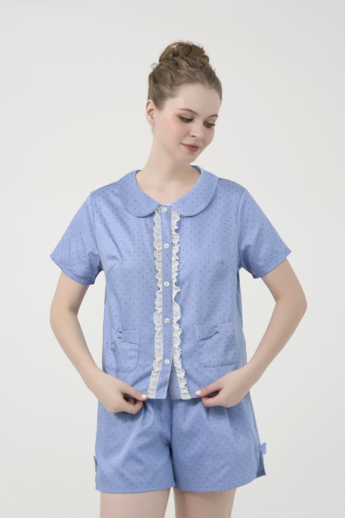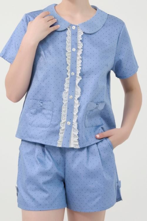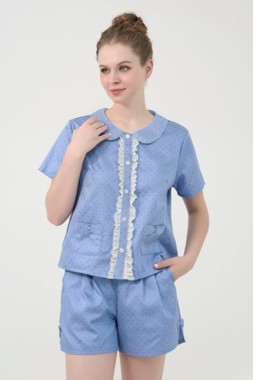 Bộ đồ mặc nhà short với thiết kế cổ lá sen độc đáo và phối ren xinh xắn mang đến vẻ ngoài ngọt ngào, nữ tính, lý tưởng cho những ngày thư giãn tại nhà