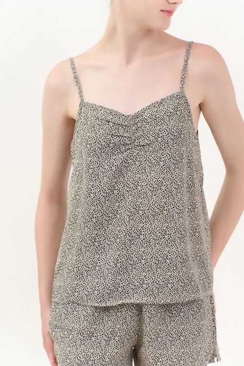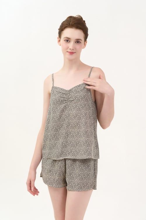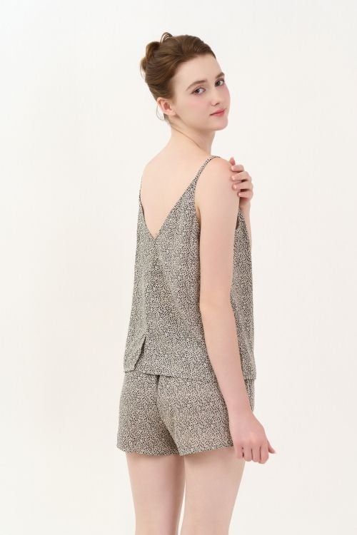 Thiết kế hai dây thanh mảnh, tạo nét quyến rũ và nhẹ nhàng. Cổ trước có dún nhẹ, giúp tôn lên vòng một đầy đặn và nữ tính kết hợp với cổ sau xẻ sâu chữ V, tạo vẻ sexy nhưng vẫn tinh tế. Quần short cạp chun co giãn, thoải mái.
