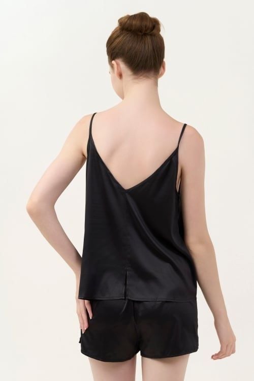 Thiết kế hai dây thanh mảnh, tạo nét quyến rũ và nhẹ nhàng. Cổ trước có dún nhẹ, giúp tôn lên vòng một đầy đặn và nữ tính kết hợp với cổ sau xẻ sâu chữ V, tạo vẻ sexy nhưng vẫn tinh tế. Quần short cạp chun co giãn, thoải mái.
