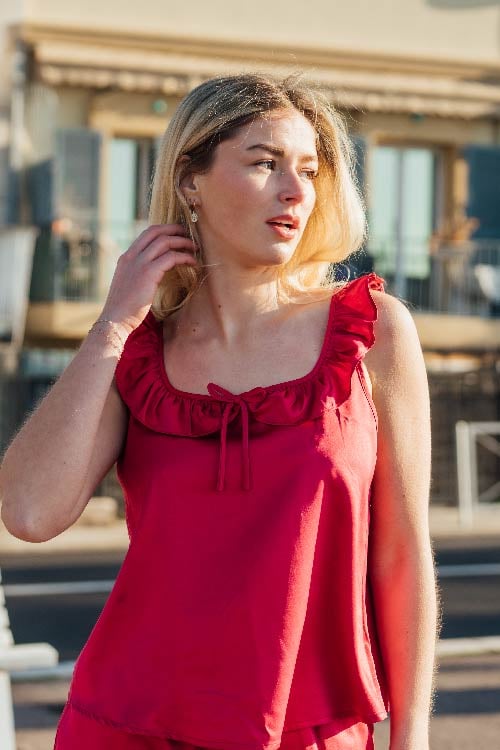 BSS01S6S01-BỘ SHORT SATIN 2 DÂY PHỐI BÈO, SẮC ĐỎ NỔI BẬT MANG ĐẾN VẺ RẠNG RỠ VÀ XINH XẮN