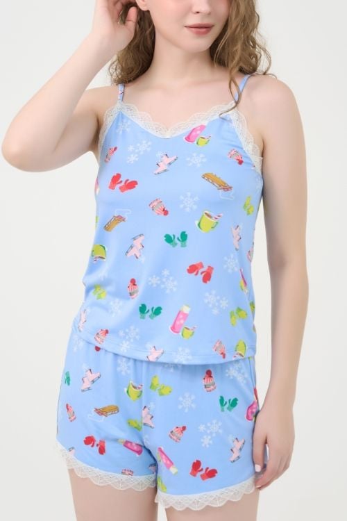 BST035S11-BỘ SHORT THUN COTTON, ÁO 2 DÂY PHỐI REN VỚI HỌA TIẾT ĐẶC TRƯNG NOEL