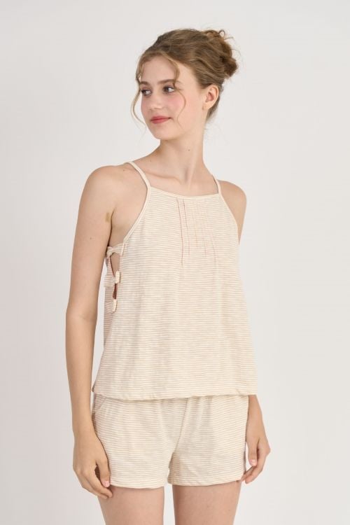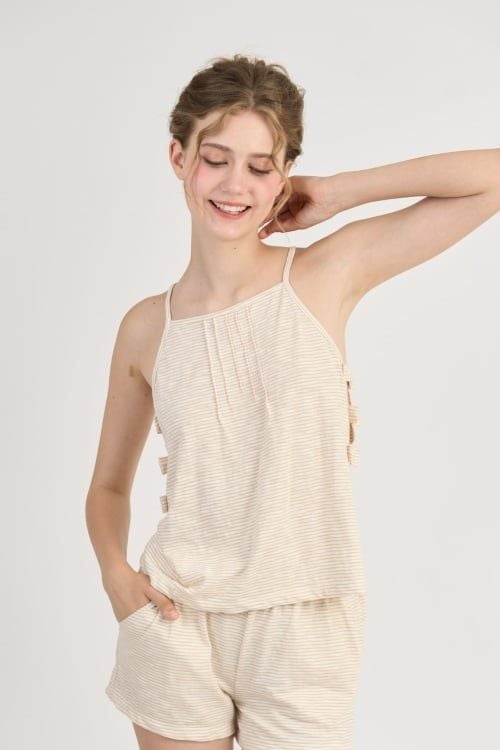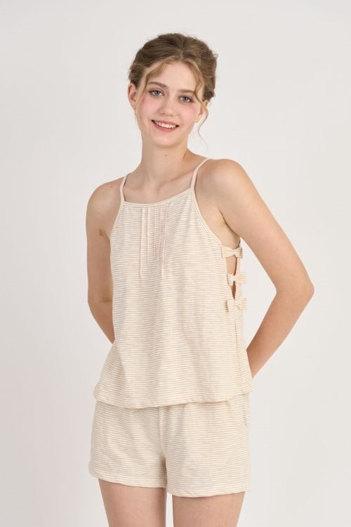 Áo thiết kế 2 dây cổ yếm đơn giản, điểm nhấn là những chiếc nơ trang trí bên sườn áo phối với quần short tạo điểm nhấn trẻ trung xinh xắn, thoải mái vận động.