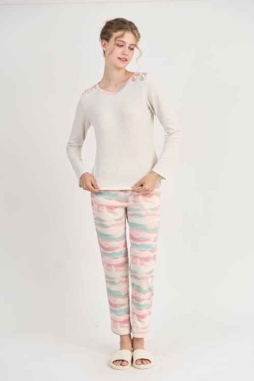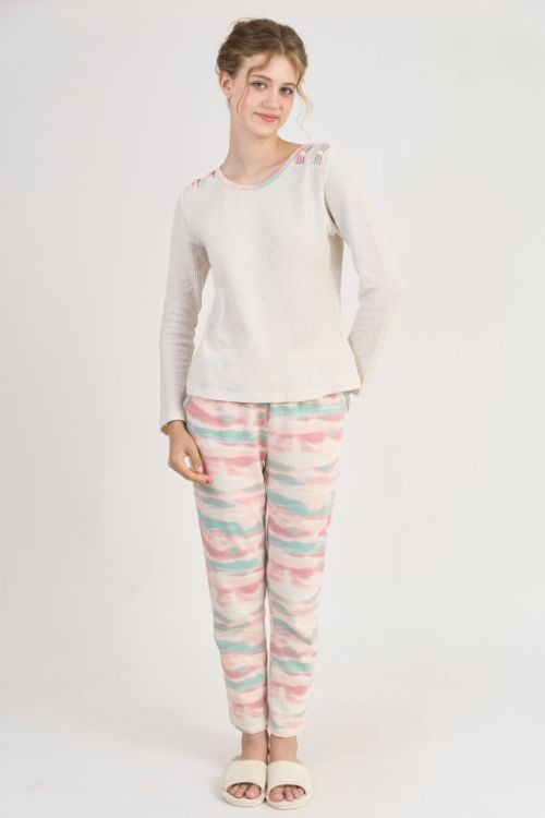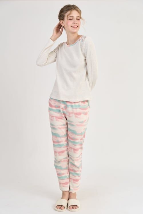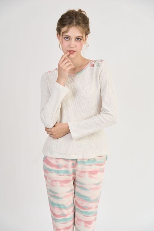 Bộ đồ thun phối áo trơn và quần họa tiết rất phù hợp để mặc ở nhà, đi ngủ hoặc đi chơi trong những ngày thời tiết se lạnh.