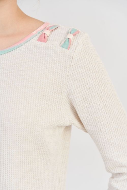 Bộ đồ có thiết kế cổ tròn đơn giản, tay dài, quần dài vai có chi tiết nơ trang trí làm điểm nhấn tinh tế . Form dáng rộng rãi, thoải mái, phù hợp với nhiều dáng người.