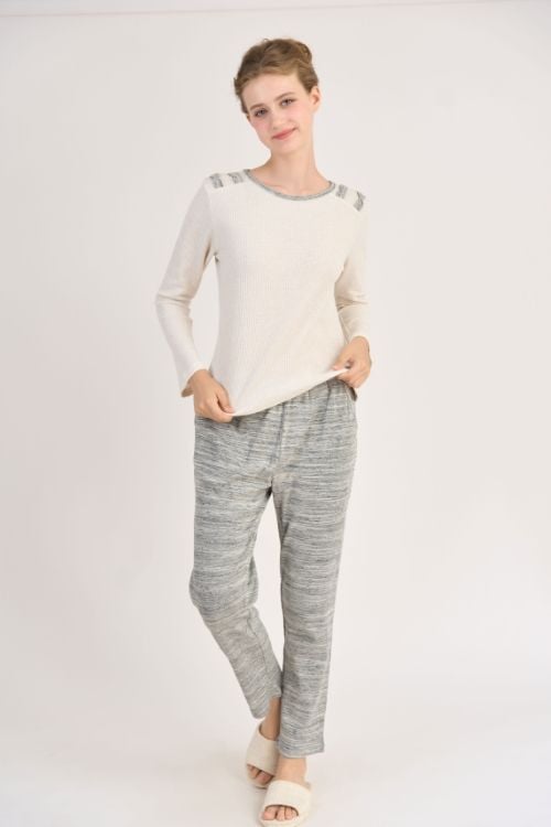 Bộ đồ thun phối áo trơn và quần họa tiết rất phù hợp để mặc ở nhà, đi ngủ hoặc đi chơi trong những ngày thời tiết se lạnh.