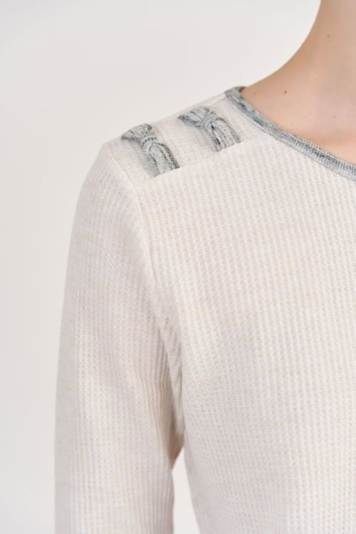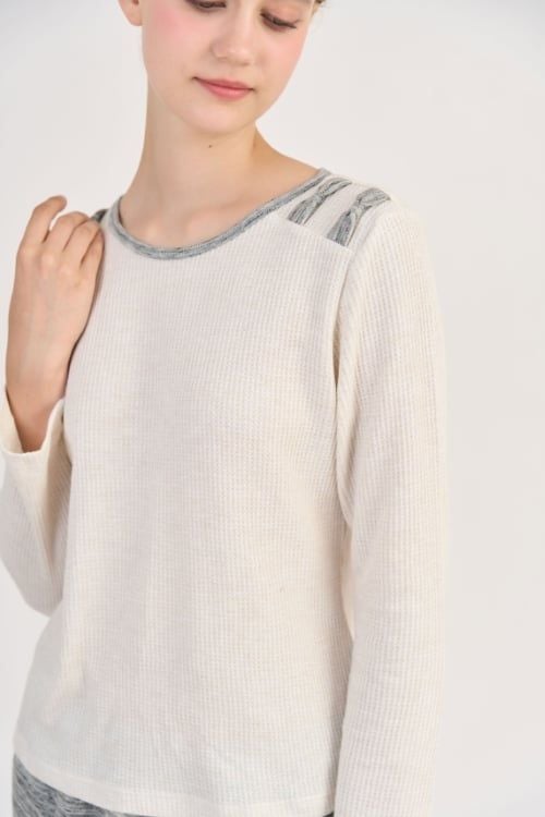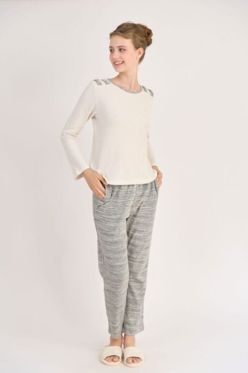 Bộ đồ có thiết kế cổ tròn đơn giản, tay dài, quần dài vai có chi tiết nơ trang trí làm điểm nhấn tinh tế . Form dáng rộng rãi, thoải mái, phù hợp với nhiều dáng người.