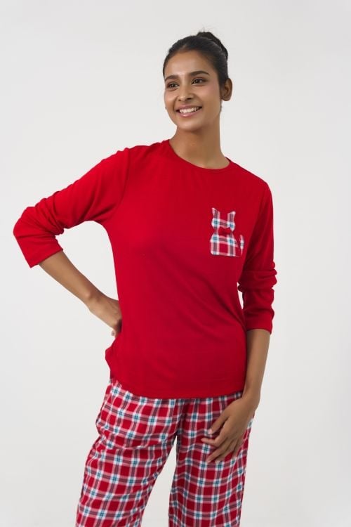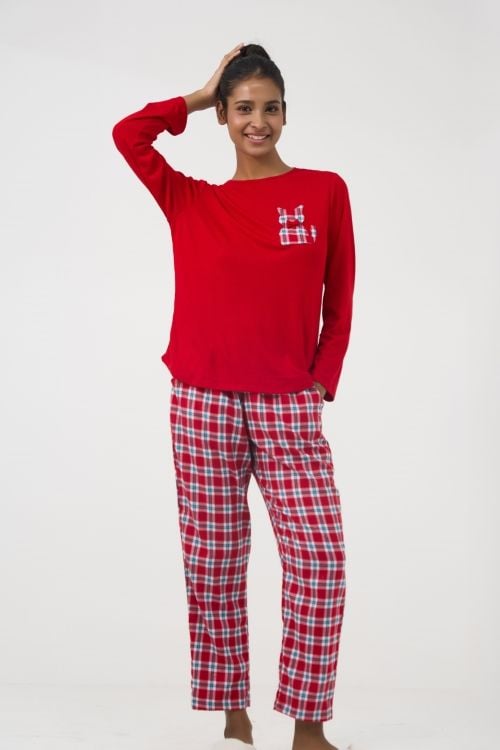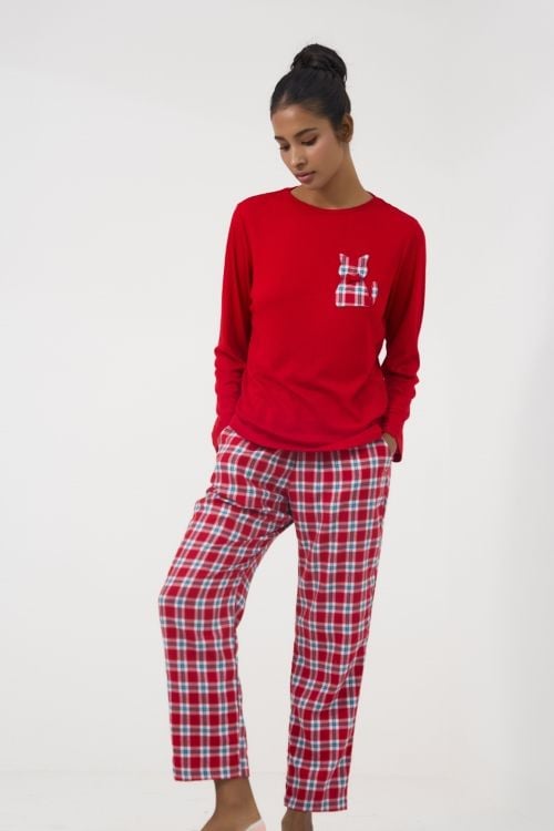 BTD041W31-BỘ DÀI TAY KẾT HỢP GIỮA ÁO THUN ĐỎ VÀ QUẦN CARO ĐỎ TẠO VẺ NGOÀI TRẺ TRUNG VÀ NĂNG ĐỘNG MÙA TẾT