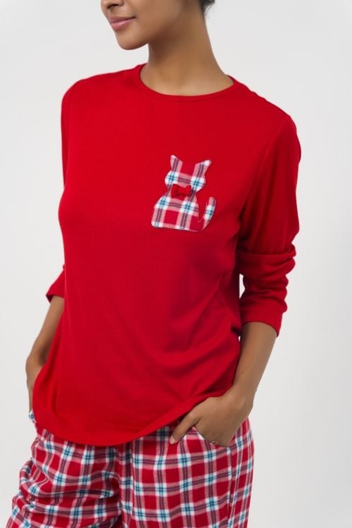 Bộ đồ mặc nhà phối quần dài họa tiết caro đỏ bằng chất kate cao cấp cùng áo thun dài tay màu đỏ nổi bật với hình mèo trang trí mang đến vẻ ngoài thanh lịch, ấm áp và thoải mái. Bộ đồ phù hợp cho những ngày Tết mát mẻ, có thể mặc ở nhà hoặc tiếp khách