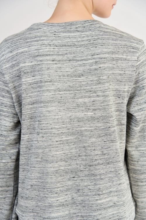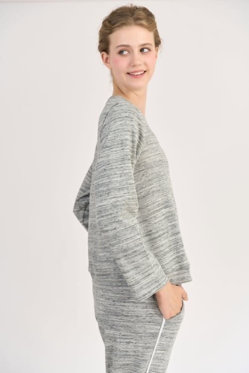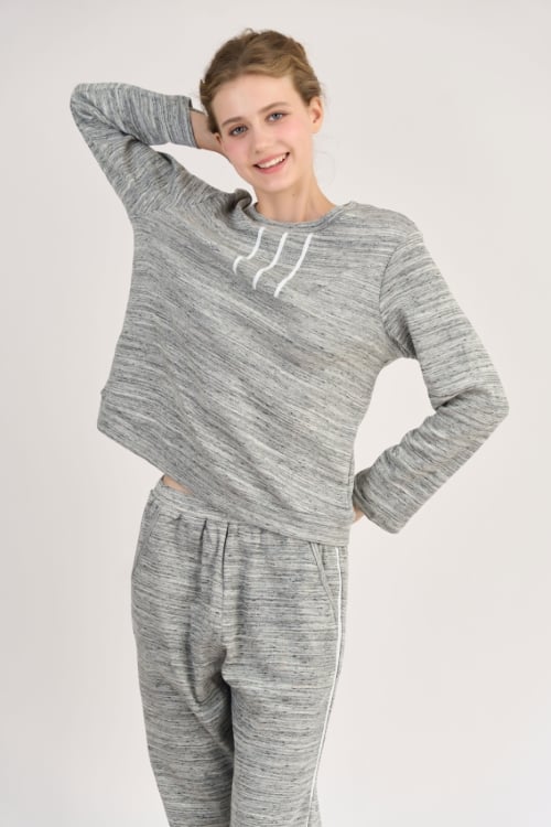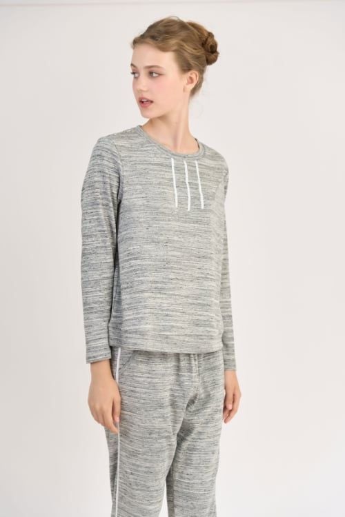 Áo thun dài tay, cổ tròn với nhừng đường trang trí ru băng làm điểm nhấn kết hợp với quần suôn tạo nên sự thoải mái tối đa khi vận động, đường may tinh tế để tăng thêm tính thẩm mỹ.