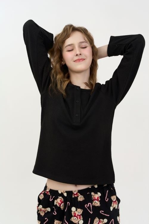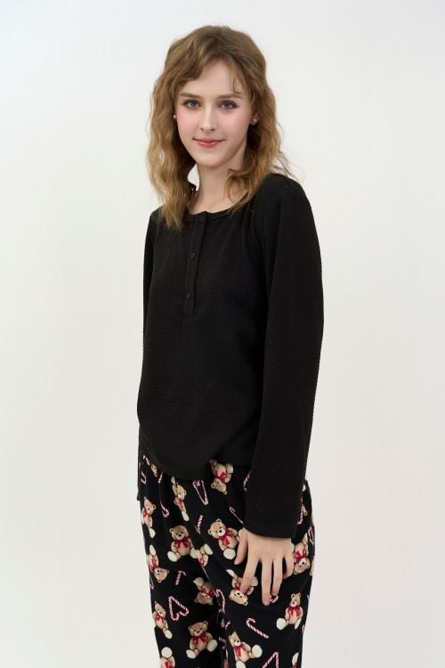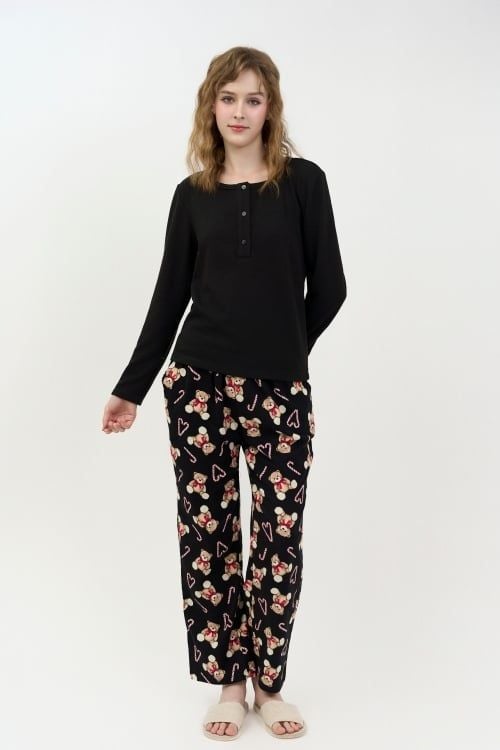 Áo màu đen kết hợp với quần họa tiết in gấu trẻ trung và năng động.