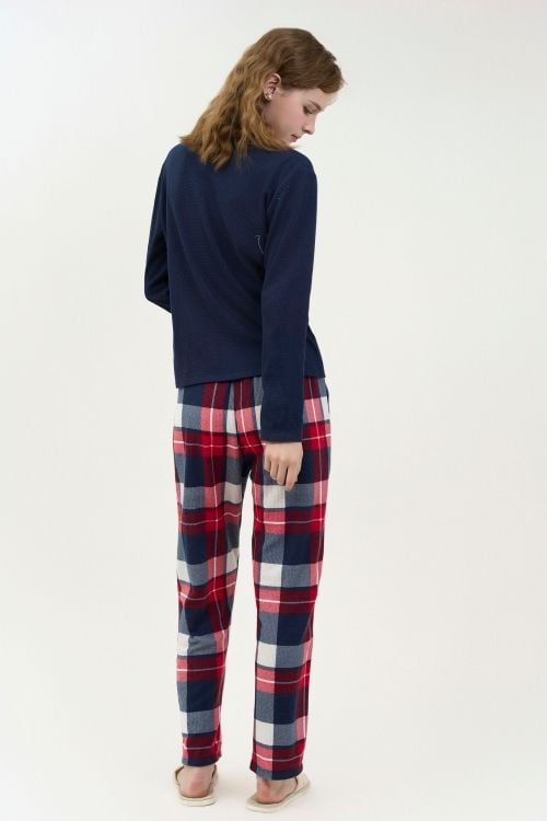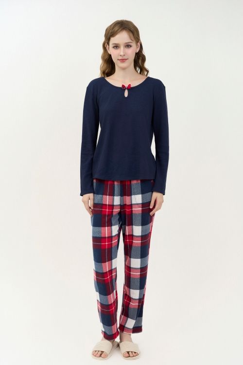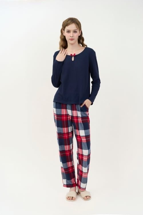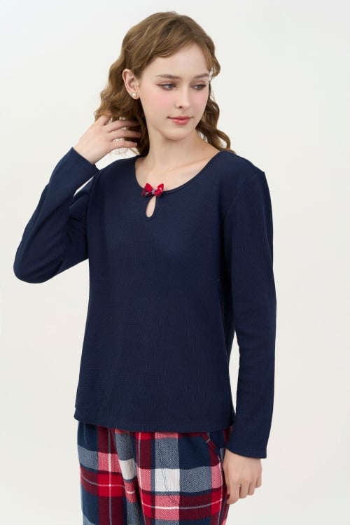 Bộ đồ có thiết kế cổ tròn đơn giản, tay dài, quần dài có chi tiết nơ trang trí làm điểm nhấn tinh tế . Form dáng thoải mái, phù hợp với nhiều dáng người.