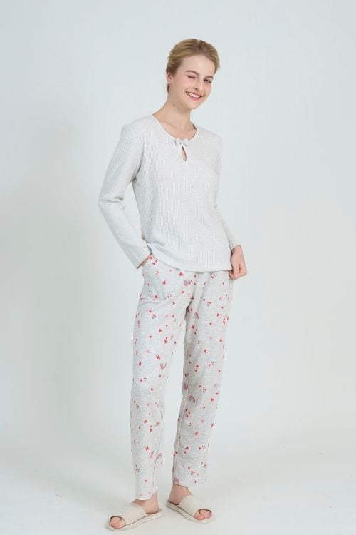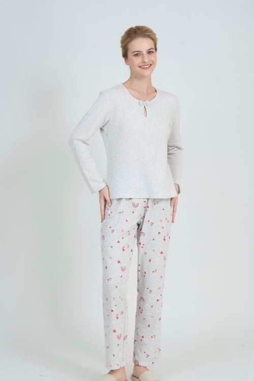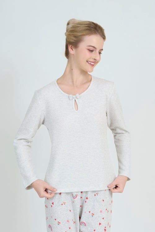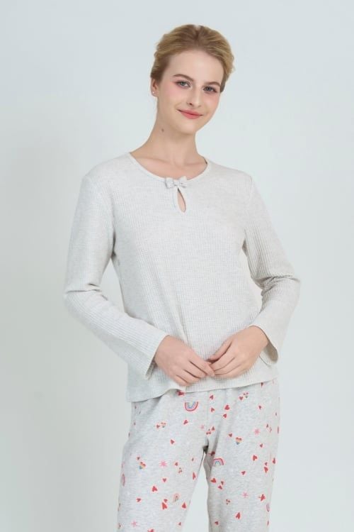 Bộ đồ có thiết kế cổ tròn đơn giản, tay dài, quần dài có chi tiết nơ trang trí làm điểm nhấn tinh tế . Form dáng thoải mái, phù hợp với nhiều dáng người.