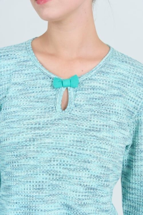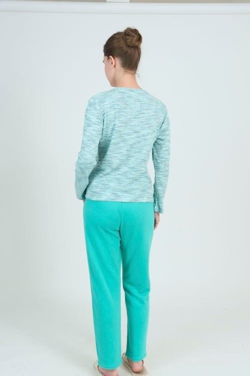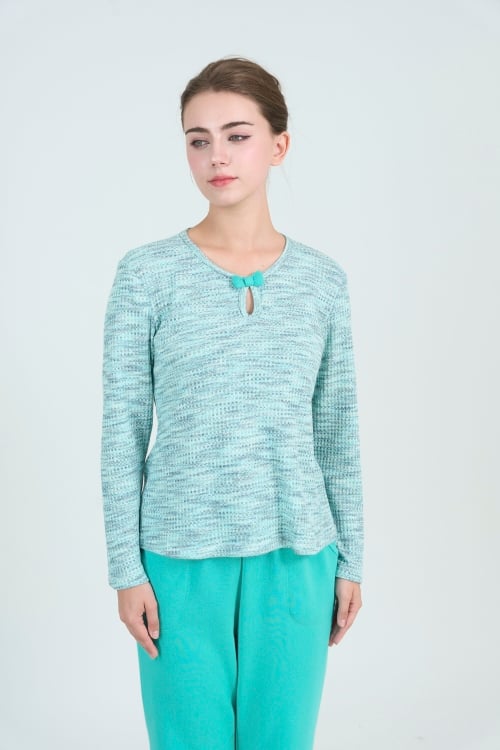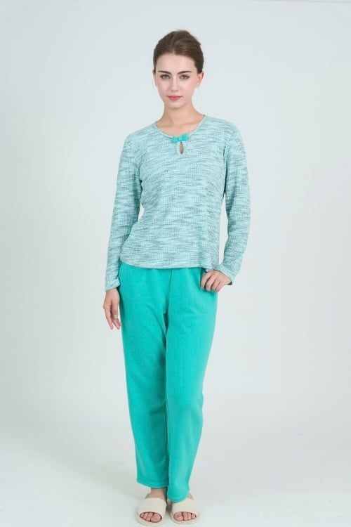 Bộ đồ có thiết kế cổ tròn đơn giản, tay dài, quần dài có chi tiết nơ trang trí làm điểm nhấn tinh tế . Form dáng thoải mái, phù hợp với nhiều dáng người.