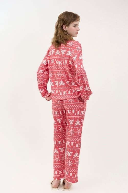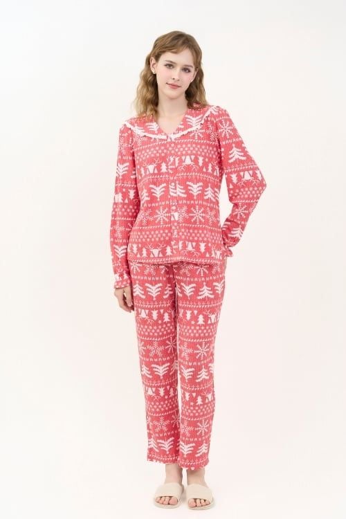 Bộ đồ có thiết kế áo cổ tim, tay dài có bo chun cửa tay cùng với đường phối ở cổ làm điềm nhấn tinh tế. Quần dài thoải mái, phù hợp với nhiều dáng người.