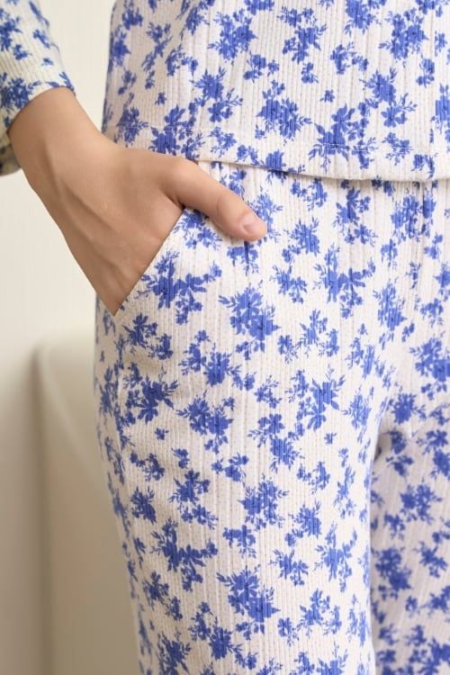 Bộ đồ có thiết kế pijama dài tay đơn giản nhưng không kém phần tinh tế. Quần dài thoải mái, phù hợp với nhiều dáng người.