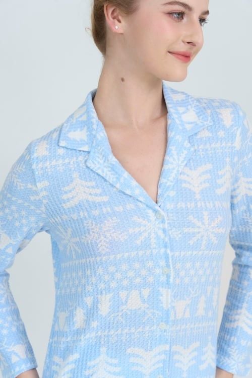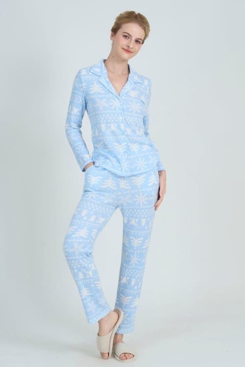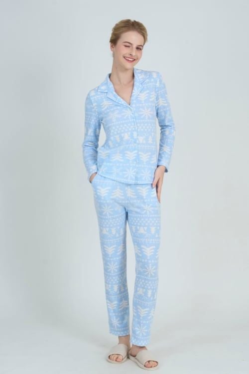 Bộ đồ có thiết kế pijama dài tay đơn giản nhưng không kém phần tinh tế. Quần dài thoải mái, phù hợp với nhiều dáng người.
