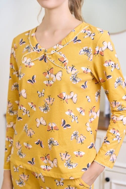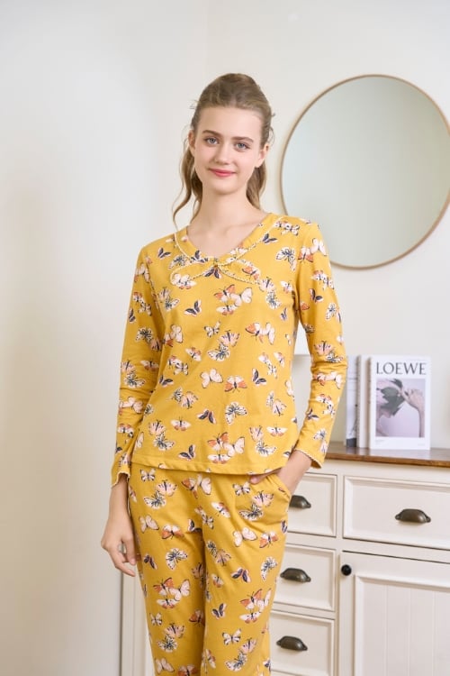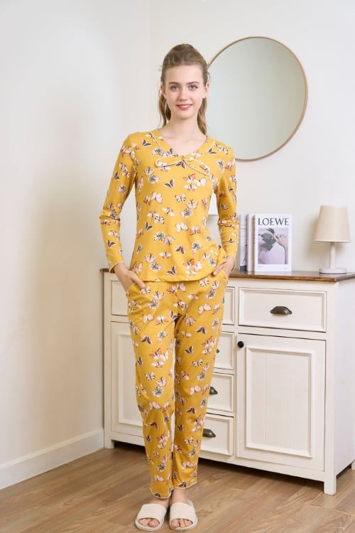 Bộ đồ có thiết kế cổ tròn đơn giản, tay dài, quần dài có chi tiết nơ trang trí làm điểm nhấn tinh tế . Form dáng thoải mái, phù hợp với nhiều dáng người.