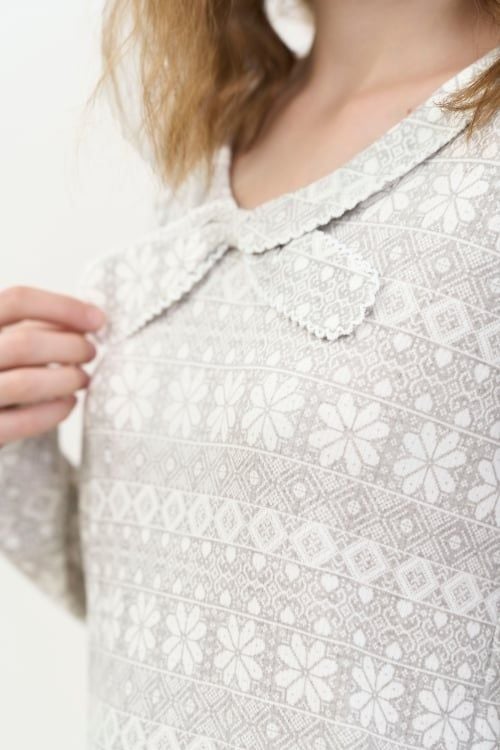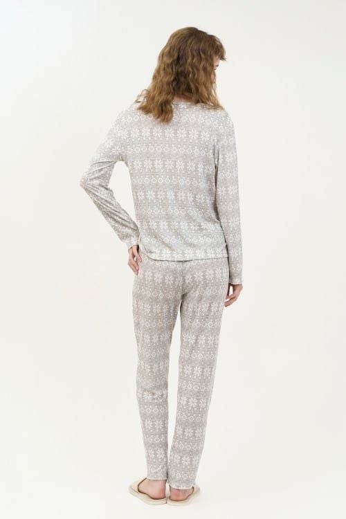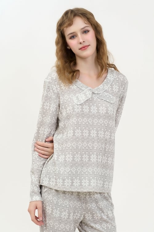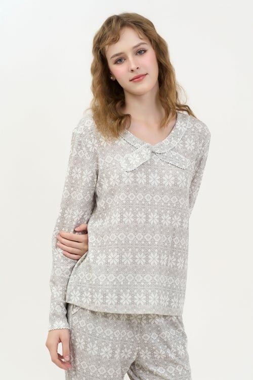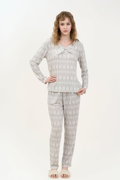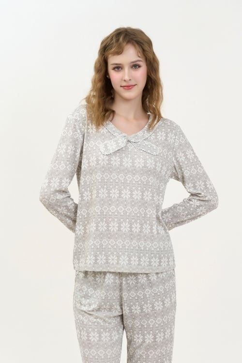 Bộ đồ có thiết kế cổ tròn đơn giản, tay dài, quần dài có chi tiết nơ trang trí làm điểm nhấn tinh tế . Form dáng thoải mái, phù hợp với nhiều dáng người.