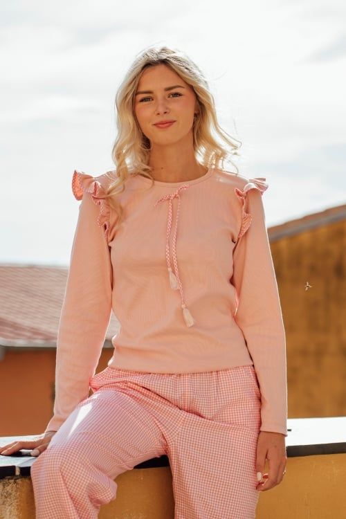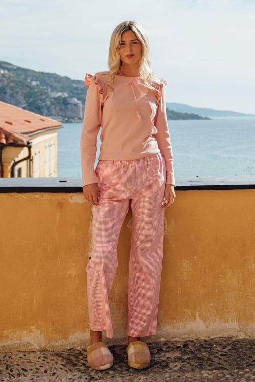 Bộ đồ mặc nhà cao cấp với thiết kế áo thun dài tay phối bèo nhún ở vai và dây buộc cổ duyên dáng, kết hợp cùng quần dài Kate caro hồng trắng cổ điển. Sự kết hợp này mang đến cảm giác ấm áp, dễ thương nhưng vẫn giữ nét thanh lịch đặc trưng cho mùa Thu Đông 2025 của VINCY.