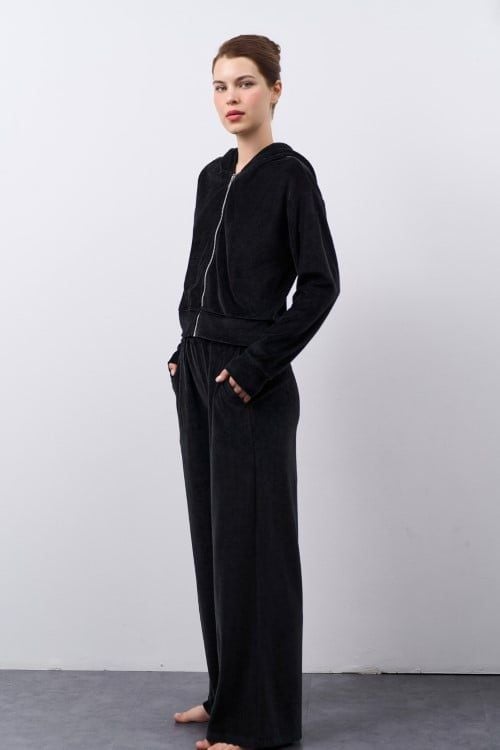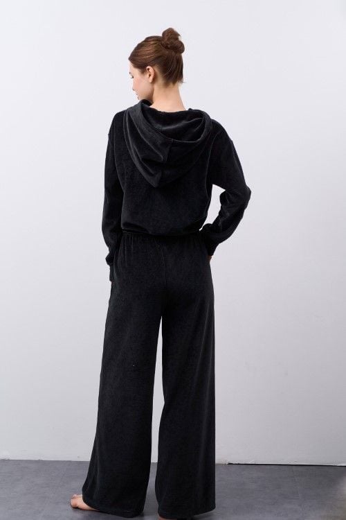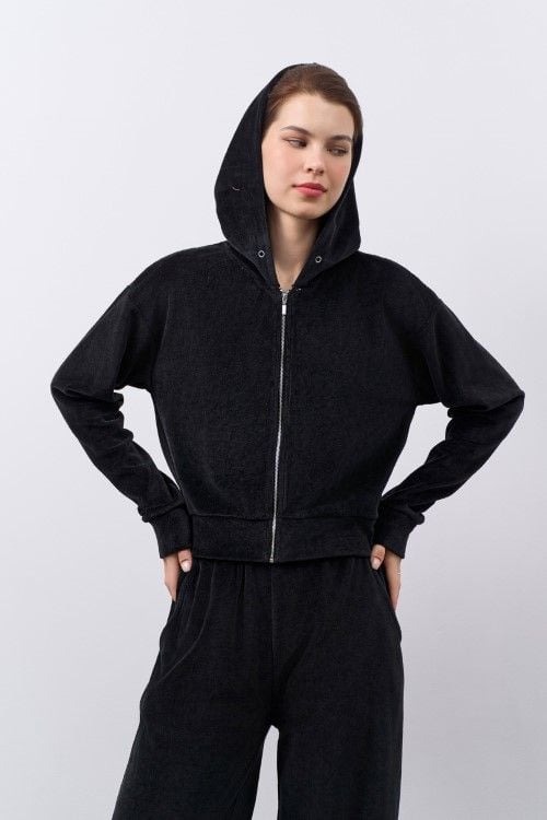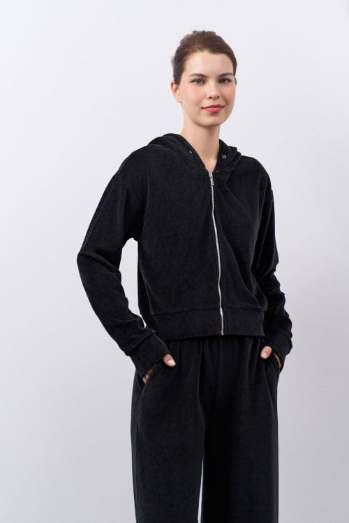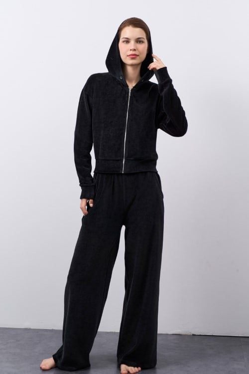 Bộ thun nhung áo tay dài quần dài, áo có nón và dây kéo kim loại thân trước.