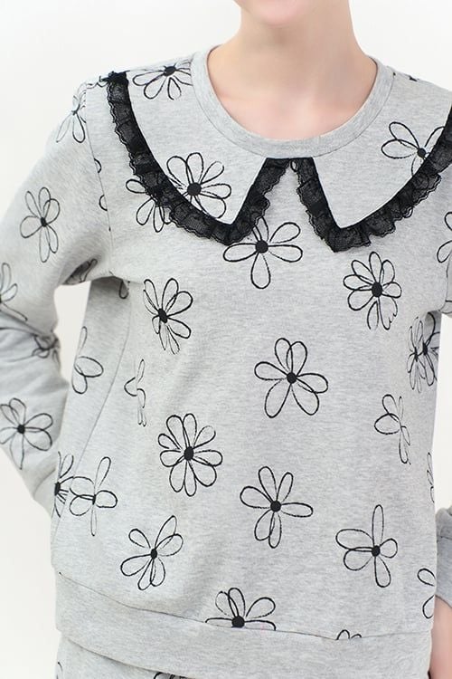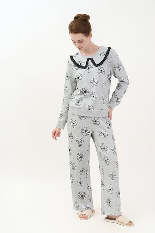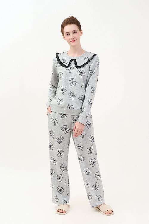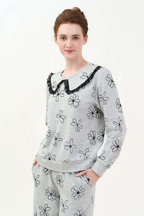 Bộ đồ có thiết kế áo cổ tròn, dài tay đơn giản nhưng có điểm nhấn là đường tráng trí bằng ren ở cổ áo. Quần dài thoải mái, phù hợp với nhiều dáng người.