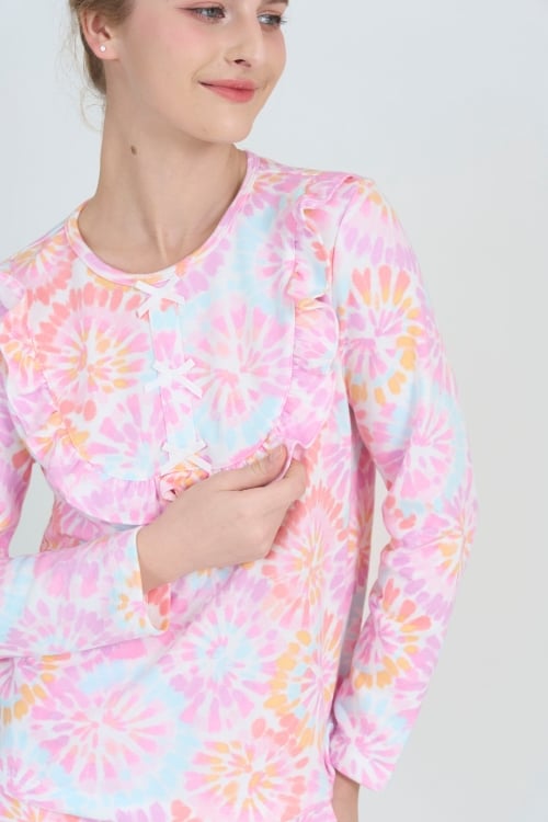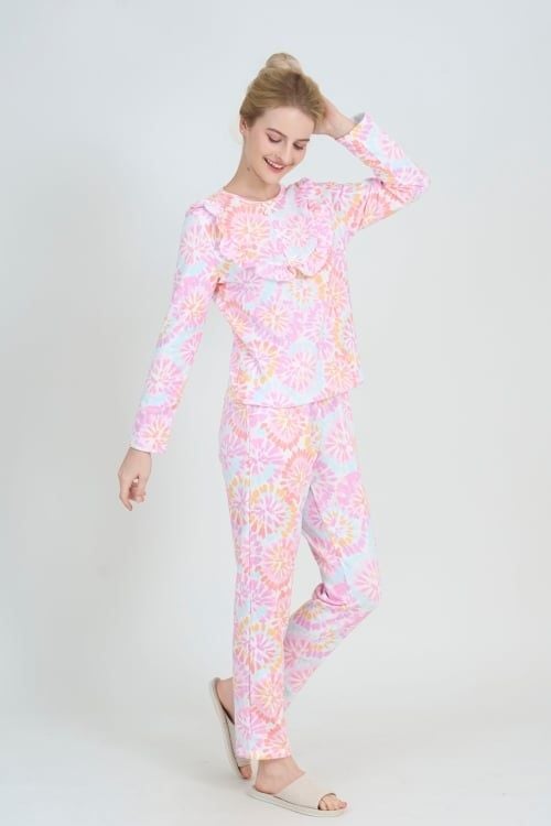Bộ đồ có thiết kế cổ tròn đơn giản, tay dài, quần dài, bèo dún đô làm điểm nhấn đặc sắc đặc sắc tinh tế . Form dáng thoải mái, phù hợp với nhiều dáng người.