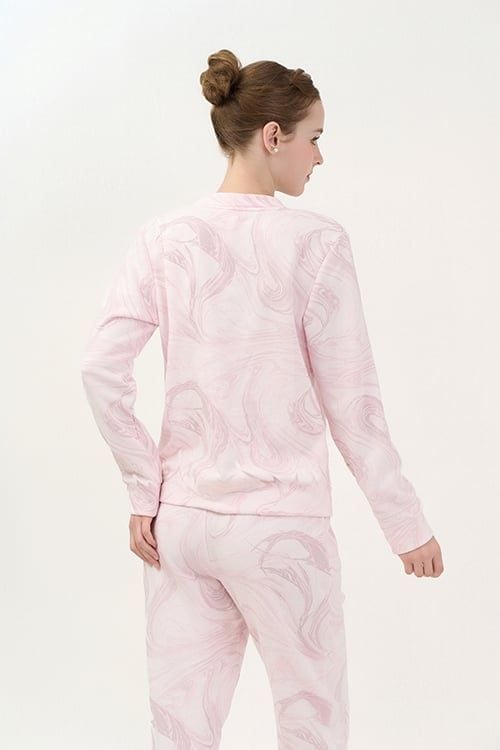 Bộ đồ có thiết kế áo cổ tròn, dài tay đơn giản nhưng có điểm nhấn là đường tráng trí bằng ren ở cổ áo. Quần dài thoải mái, phù hợp với nhiều dáng người.