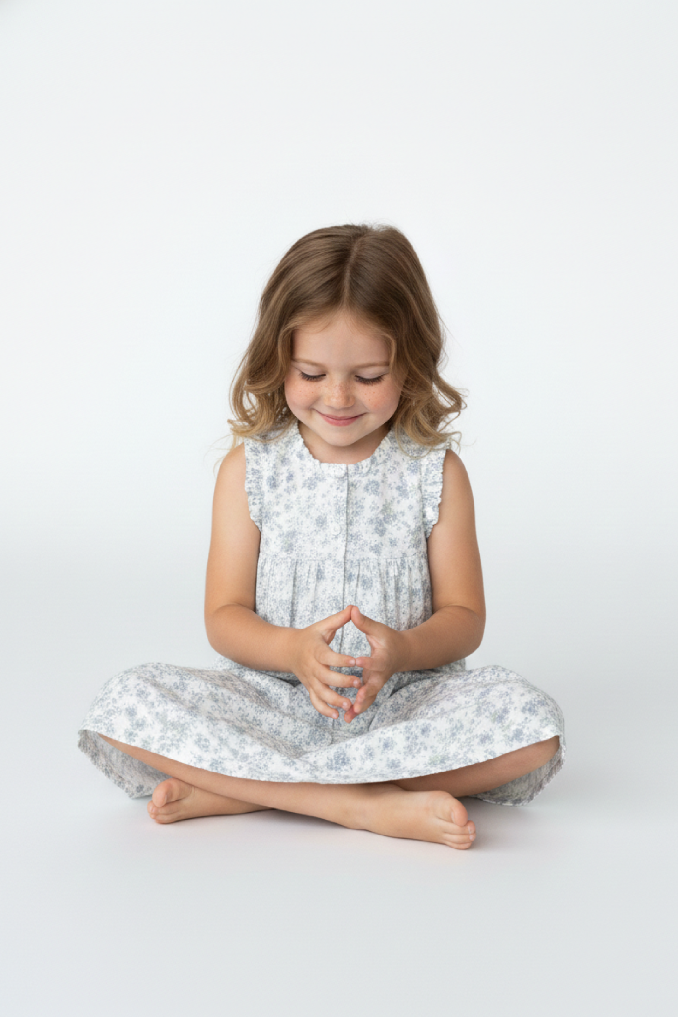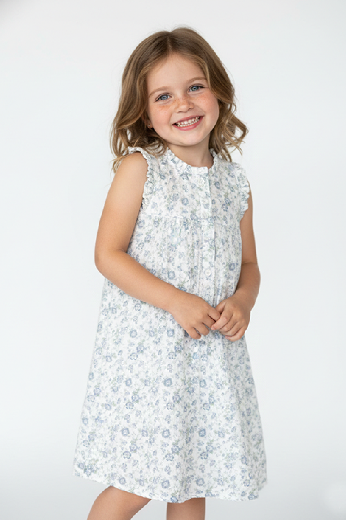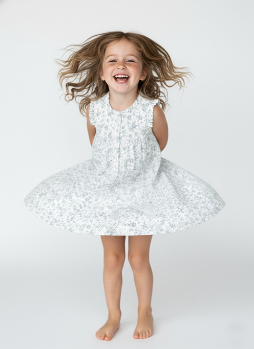 Họa tiết hoa nhí sắc xanh dịu mắt trải đều trên nền vải trắng mang đến cảm giác tươi mới, dịu dàng như hơi thở của mùa xuân. Đặc biệt, đây là trang phục có set cho Family, cho phép bé cùng mẹ diện đồ đồng điệu, tạo nên sự gắn kết đầy tinh tế và ấm áp.